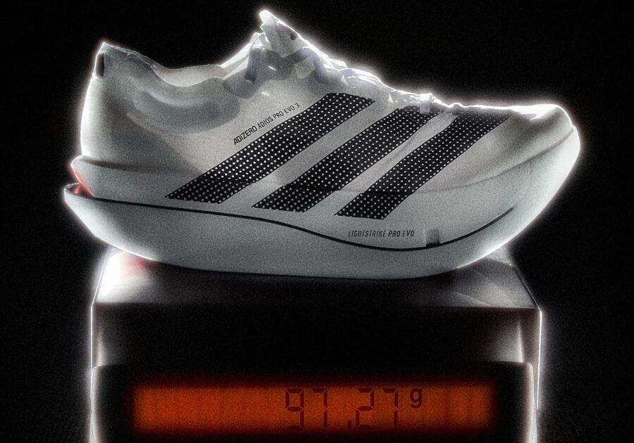 アディゼロ アディオス プロ エボ3は平均重量97グラムで、業界初の100グラム以下を達成したスーパーシューズです。